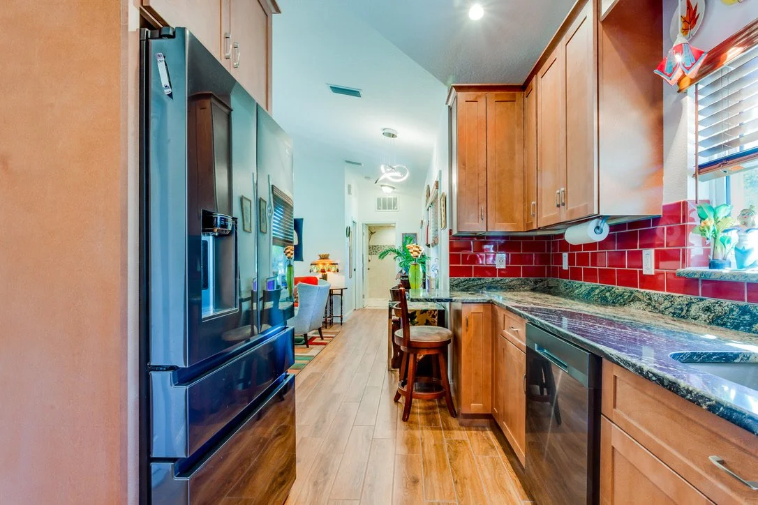 The addition boasts expansive windows and glass doors, inviting the lush outdoor scenery into the living space, while strategically placed smaller windows along the streetside ensure optimal cross-ventilation. Inside, vaulted ceilings and an open floor plan imbue the area with a sense of airiness and freedom.